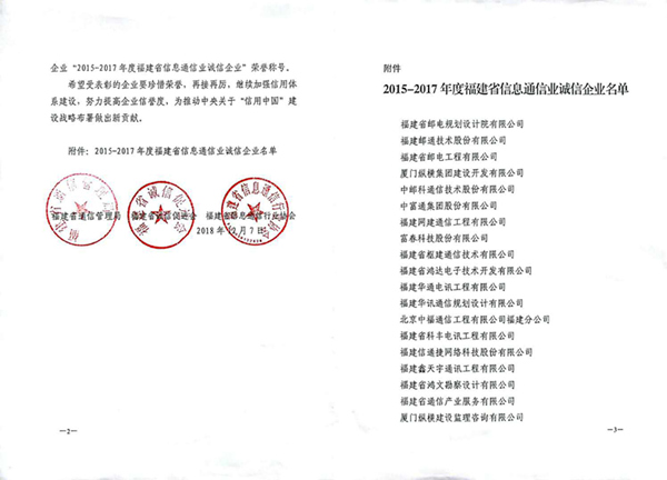 據了解,福建省通信業誠信企業由福建省通信管理局、福建省誠信促進會、福建省通信行業協會聯合組織,自2006年起,每三年評選一次,此次是第五次評選。旨在進一步促進通信建設、增值電信企業提升誠信意識、質量意識、安全意識和服務意識,號召其他企業學習先進的管理經驗和經營之道。經企業報送、資格審查、專家評分和公示后,全省最終評選出符合參評條件 家企業。